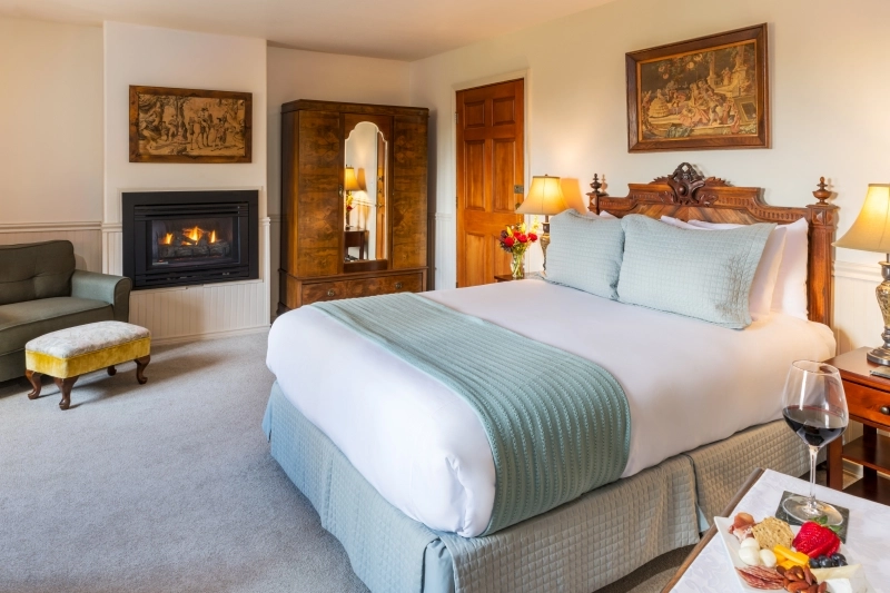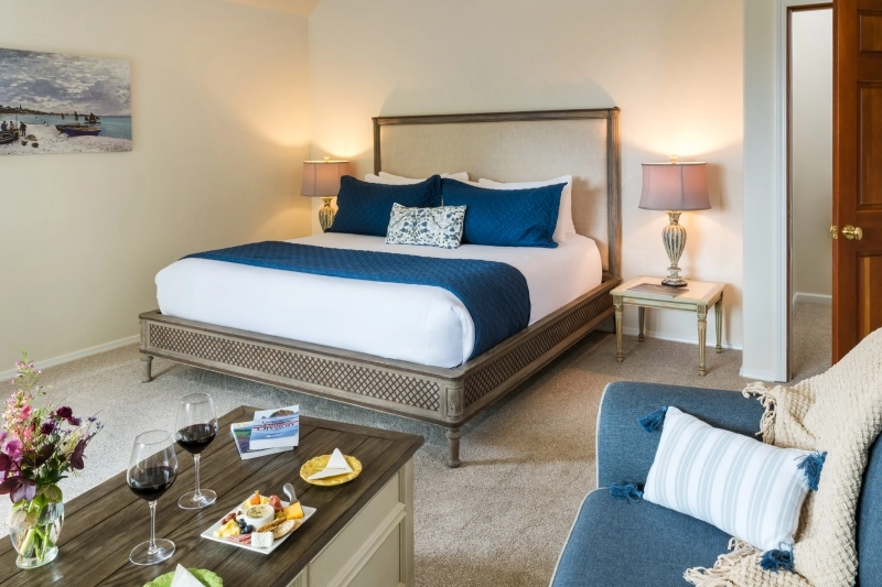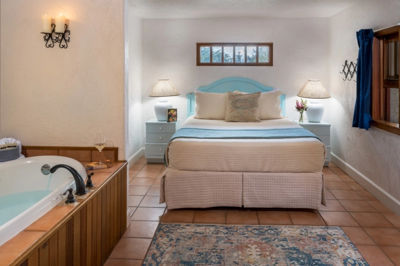 Designed for relaxation, the Barcelona Room features a plush queen bed, a deep soaking tub to soothe your senses, and a cozy gas fireplace for those cool coastal evenings. Your private bathroom with a walk-in shower and modern amenities bring comfort to this peaceful escape.