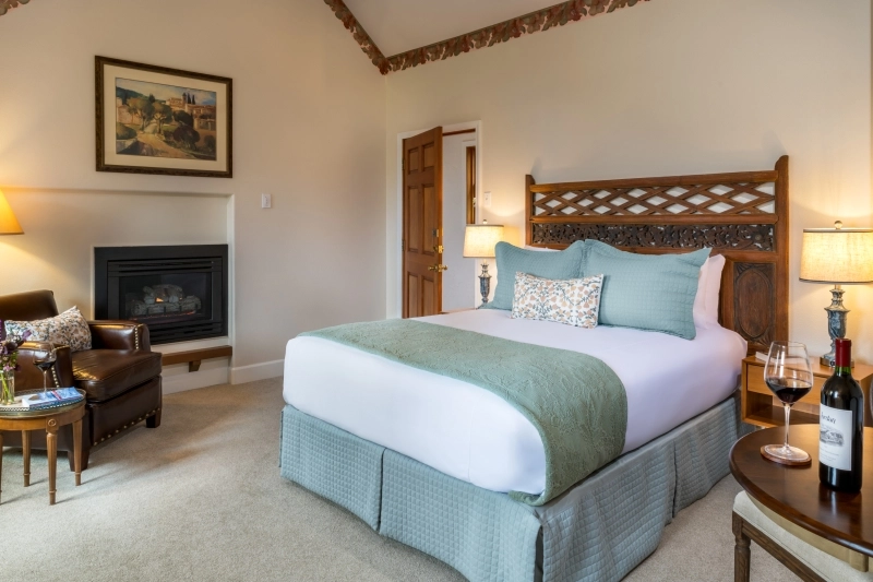 This romantic suite features a private balcony overlooking lush gardens and the surrounding forest—a perfect spot for morning coffee or sharing a glass of local wine at sunset. Relax in the cozy sitting area by the gas fireplace or unwind with your favorite show.